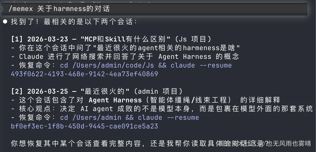 ▎ 你跟 AI 聊过的每一段对话,全文检索秒级定位,提供恢复命令,一键恢复继续。