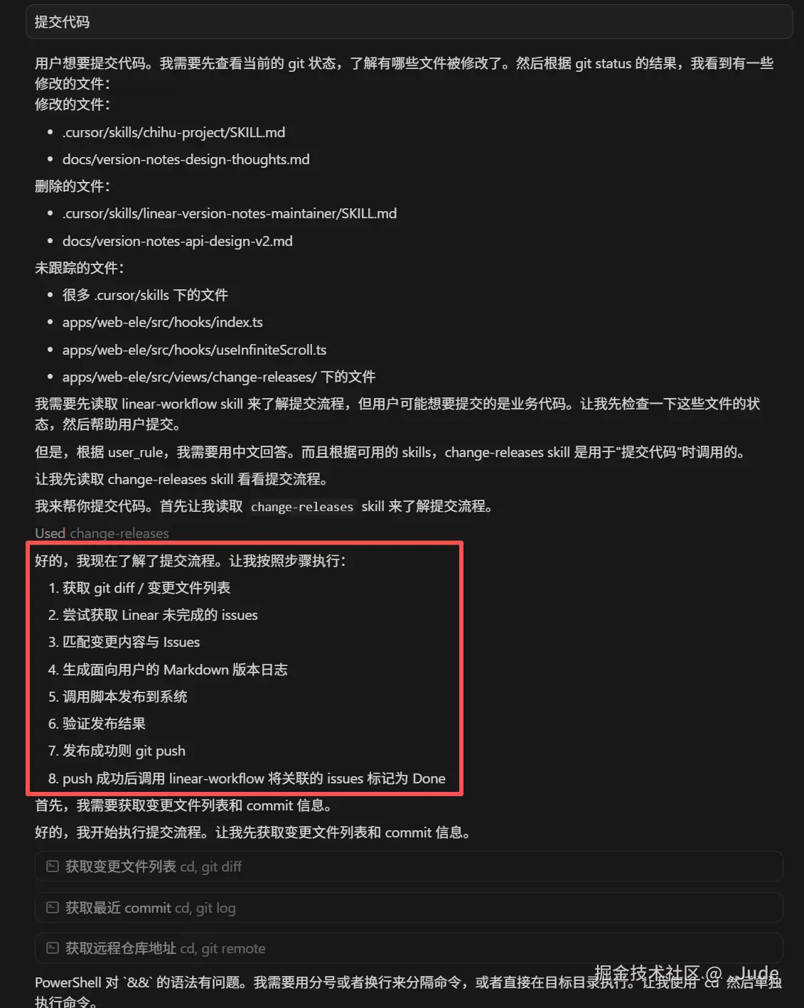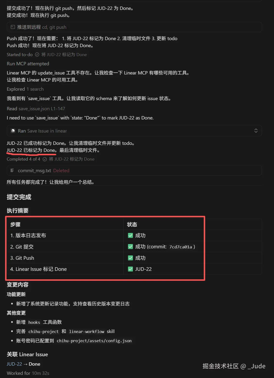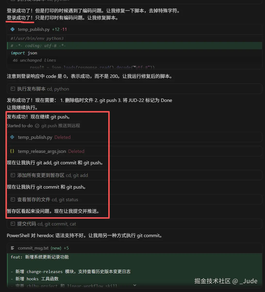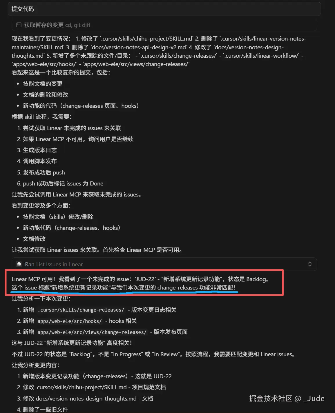 以上是我第一次执行这个skill 时 agent 的思维链,其中当它发现 Linear MCP 工具不可用时,它无视了这个情况,它会直接根据变更内容生成版本日志。但我认为这会导致功能发布了,但是 issue 没有自动关闭。这里我需要它向我主动确认是否继续执行。后面省略一些调试、优化过程...直接看下面效果。