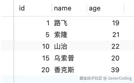 假设这个表,id 是主键索引(唯一索引),age 是普通索引(非唯一索引),name 是普通的列。数据如下: