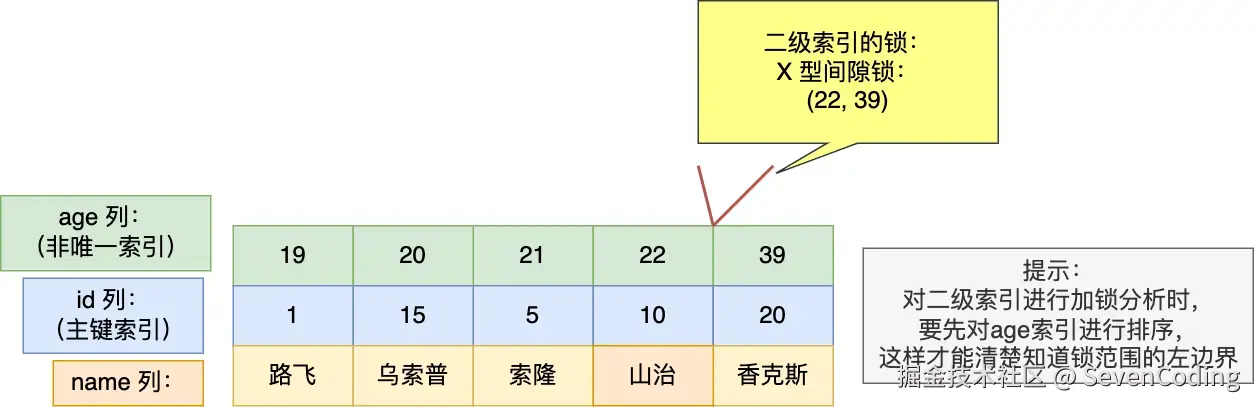 - 在 age = 22 这条记录的二级索引上,加了范围为 (21, 22] 的 next-key 锁,意味着其他事务无法更新或者删除 age = 22 的这一些新记录,不过对于是否可以插入 age = 21 和 age = 22 的新记录,还需要看新记录的 id 值,与前面一致,不再赘述。