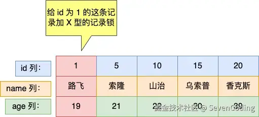 那么,事务 A 会为 id 为 1 的这条记录就会加上 X 型的记录锁。