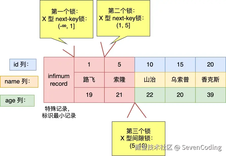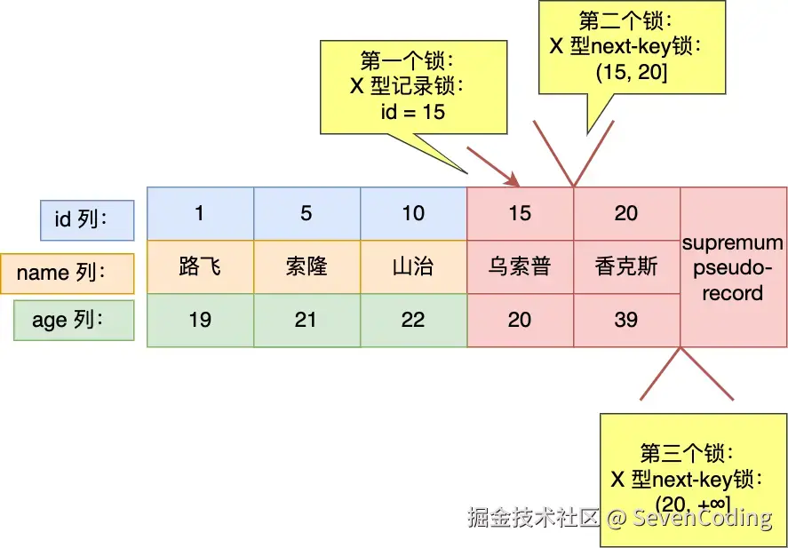 - 在 id = 20 这条记录的主键索引上,加了 next-key 锁,范围是 (15, 20] 。意味着其他事务即无法更新或者删除 id = 20 的记录,同时无法插入 id 值为 16、17、18、19 的这一些新记录。