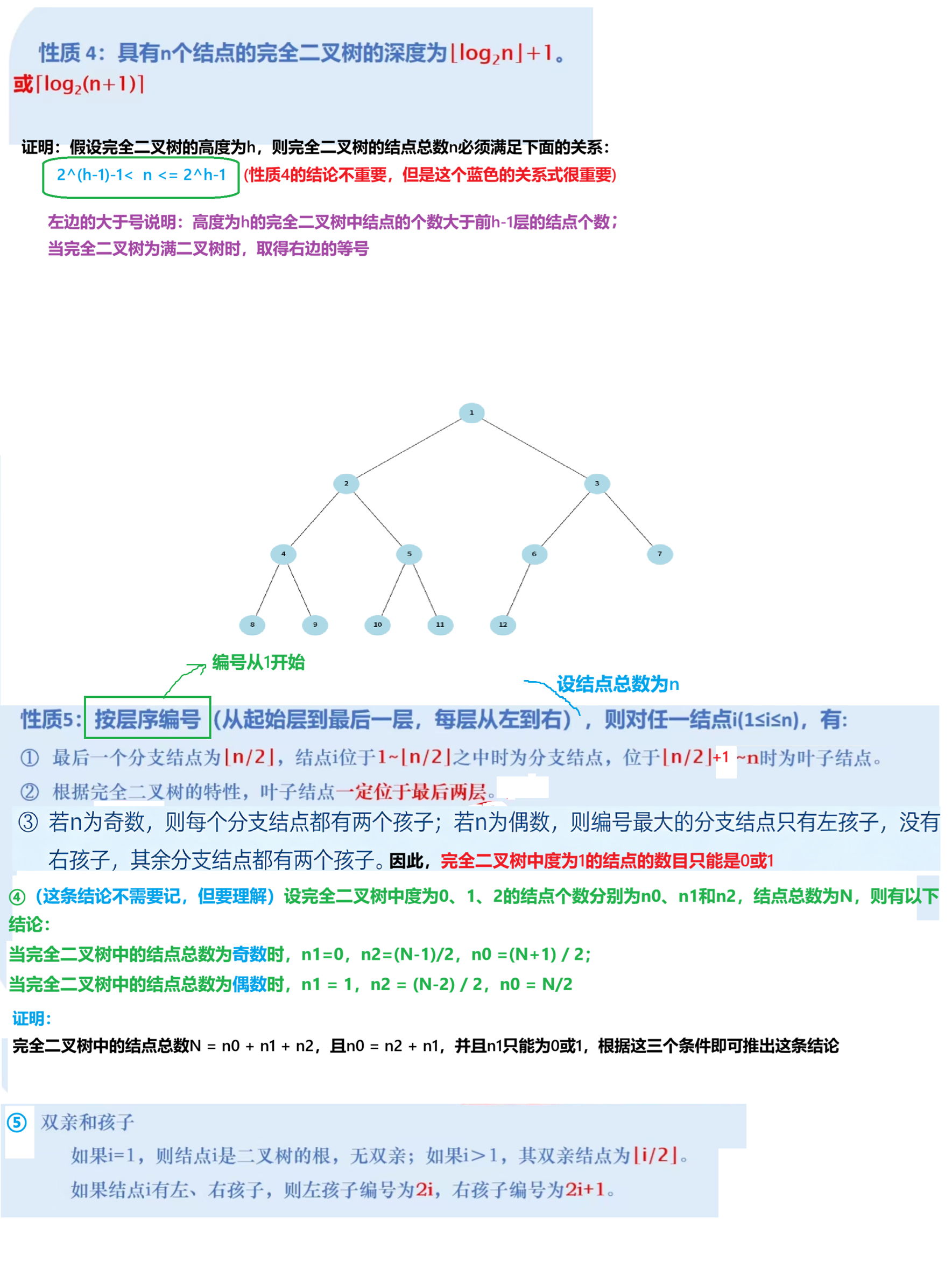 假设完全二叉树的结点个数为n,完全二叉树中的结点采用从上到下,从左往右的顺序存储,若结点的下标从0开始编号(因为数组的下标是从0开始的),则对于下标为i的结点满足以下4条性质: