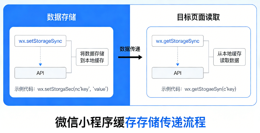 缓存存储传递是利用小程序提供的缓存 API(如 wx.setStorageSync 和 wx.getStorageSync 或 wx.setStorage 和 wx.getStorage)将数据存储到本地缓存中,在目标页面从缓存中读取数据。