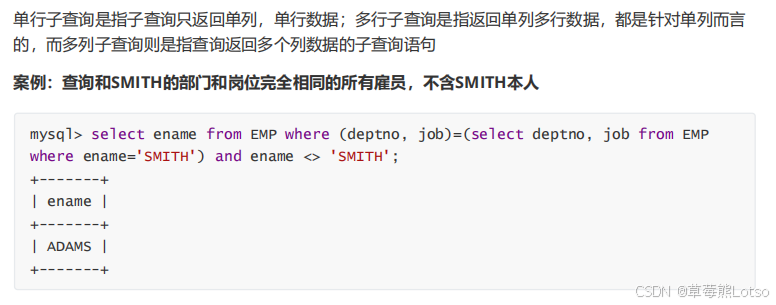 where (deptno, job) = (select deptno, job from emp where ename='smith') -- 匹配部门+岗位组合