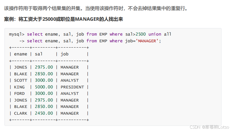 合并查询:union(去重)和 union all(不去重),适用于多结果集合并;