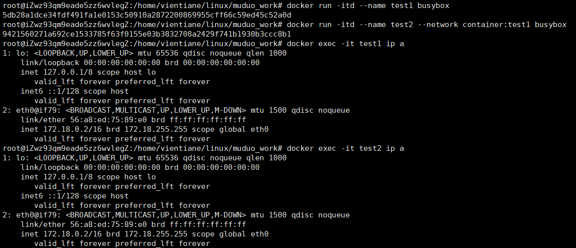 - 查看两个容器的ip信息,会发现两个ip和mac完全一样