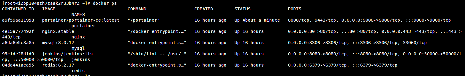 - SSH连接阿里云服务器,执行命令:docker ps