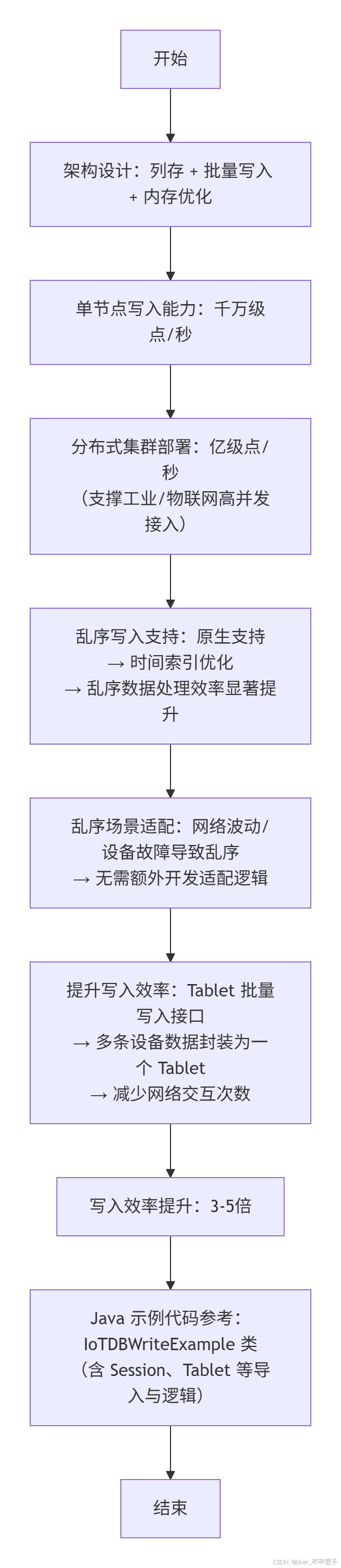 Apache IoTDB采用列存架构+批量写入+内存优化 的组合设计,单节点写入能力可达到千万级点/秒 ,分布式集群部署时,可实现亿级点/秒的写入能力,能够轻松应对工业、物联网等场景的高并发数据接入需求。同时,IoTDB原生支持乱序写入,通过时间索引优化,乱序数据处理效率相比国外同类产品有显著提升,可完美适配工业设备数据采集过程中因网络波动、设备故障导致的乱序问题,无需额外开发适配逻辑。