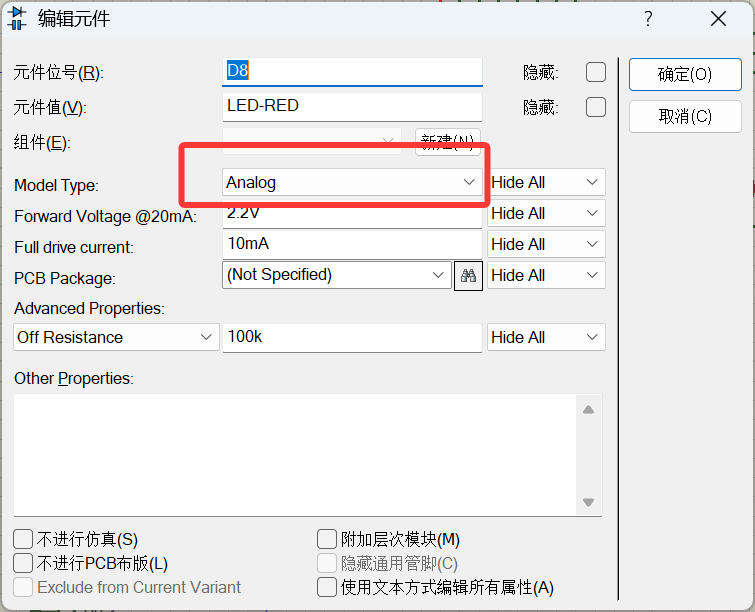 - Other Properties空白区域,用于填写自定义属性(如厂商、型号描述),仿真 / PCB 设计中一般无需修改。