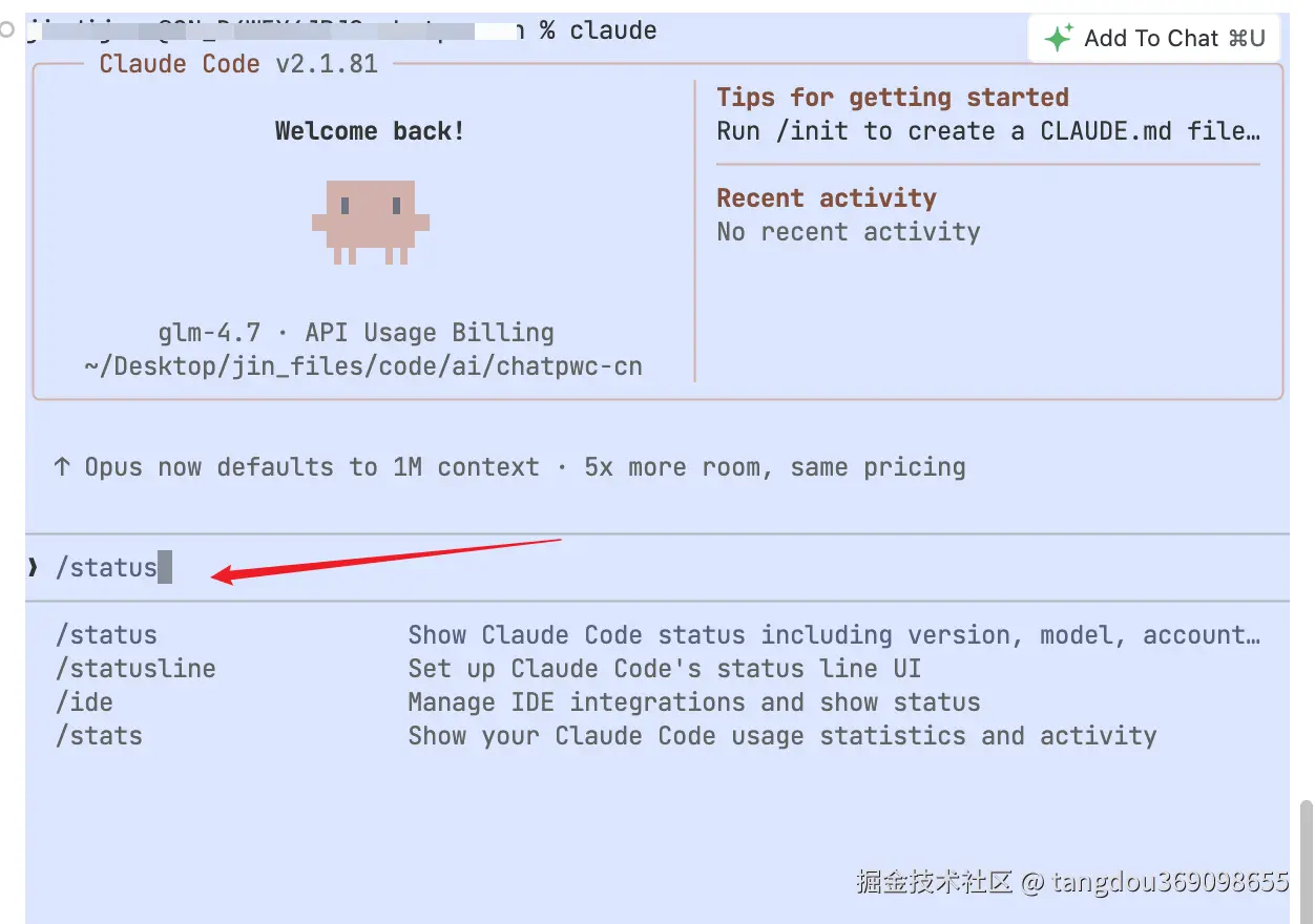 2. 在命令行窗口,启动 Claude Code 后,输入/status确认模型状态。 |
