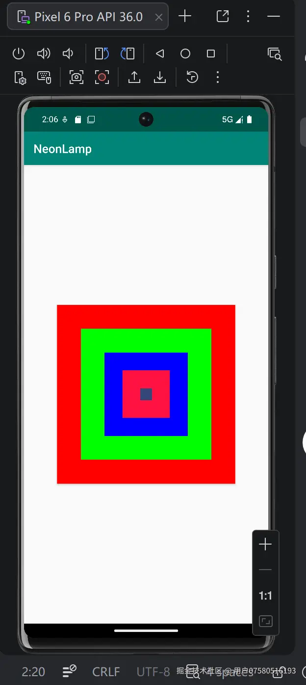 match_parent:布局宽高铺满整个屏幕。layout_gravity="center":让所有按钮在布局中居中显示,是实现同心圆效果的关键。background:为按钮设置不同纯色背景,形成霓虹灯色彩层次。- 层叠规则:红色(最大)→ 绿色 → 蓝色 → 粉色 → 深蓝(最小),后添加的控件显示在更上层。