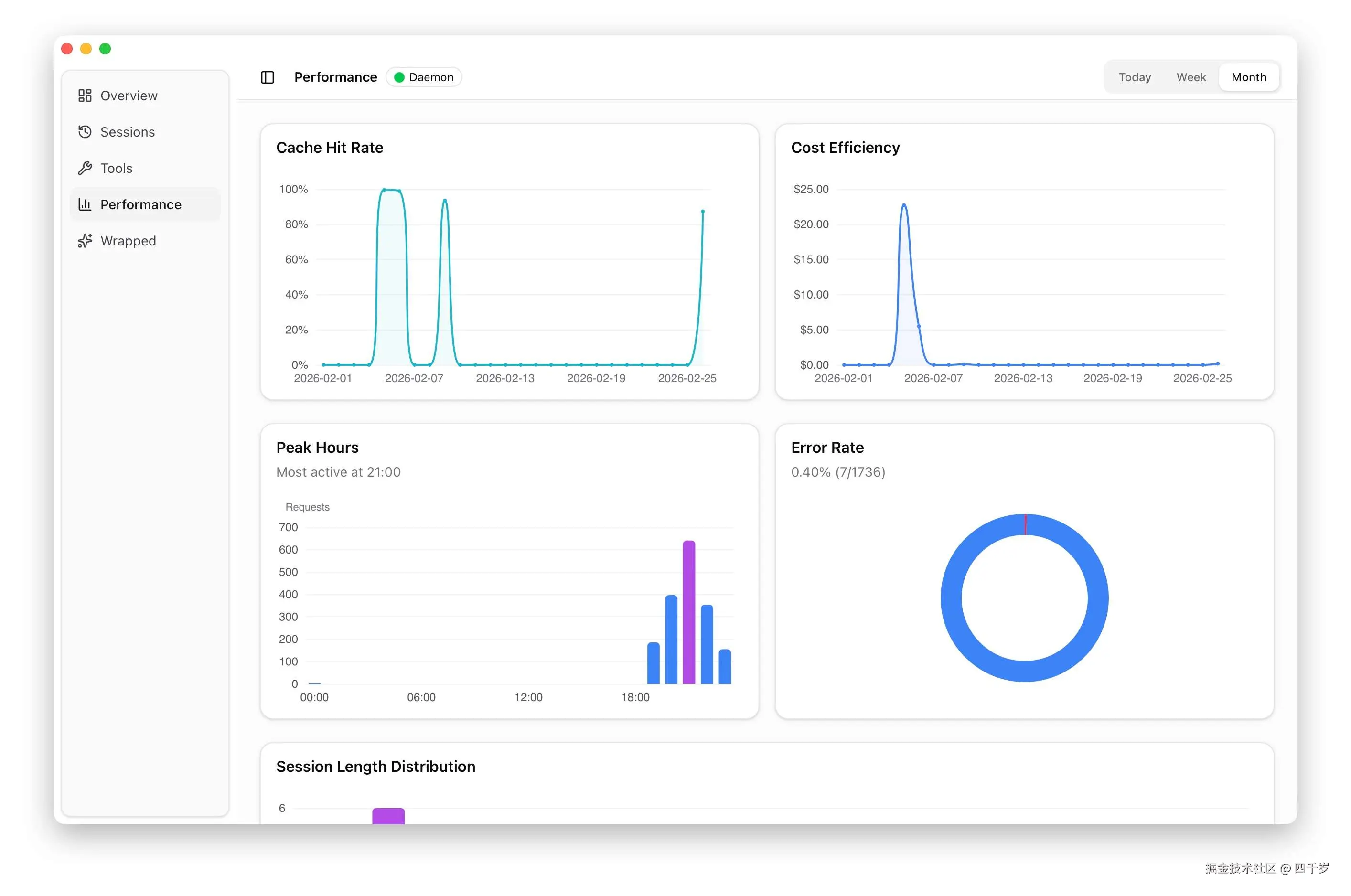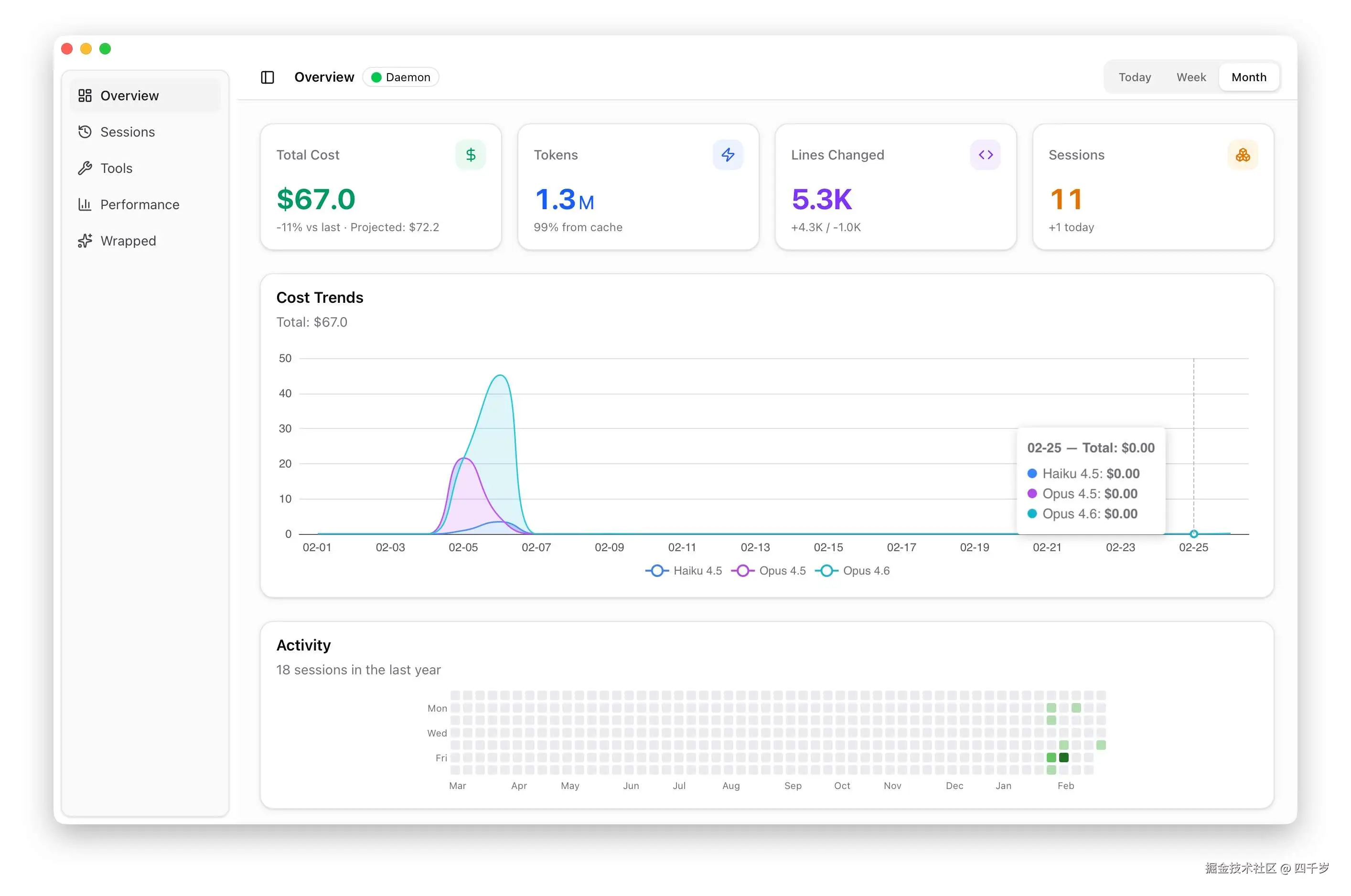 lumo这个工具只能统计分析ClaudeCode的 Token 使用情况,并且这个工具仅支持 ClaudeCode 官方付费订阅用户使用,优势是提供可视化操作界面。可以更直观地看到 ClaudeCode 的使用情况。Github 地址:lumo[1]。目前 lumo 还不支持 Windows,不过作者正在开发 Windows 版本的 lumo。