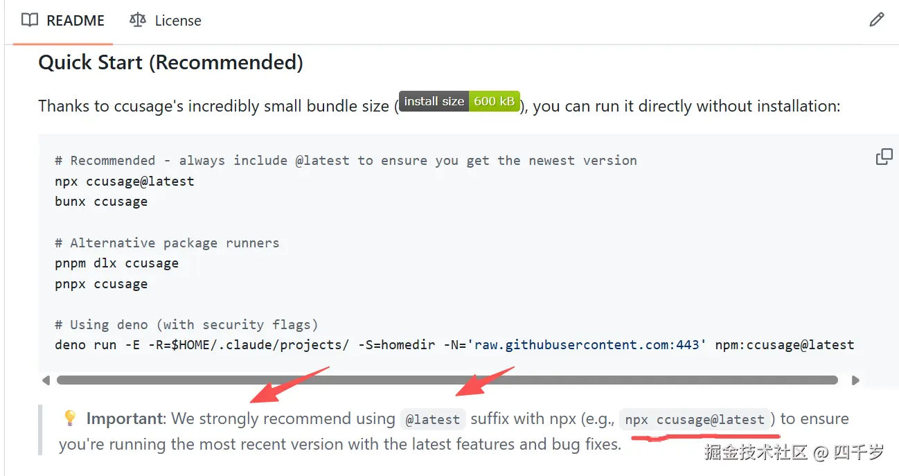 官方强烈建议,若通过npx方式使用,每次都加上 @latest 后缀,这能确保你使用的ccusage始终是最新版本。