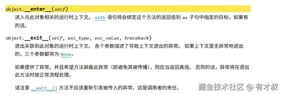 那么它是怎么做到如此靠谱的呢?其实背后是两个特殊方法在支撑:__enter__()和__exit__()。