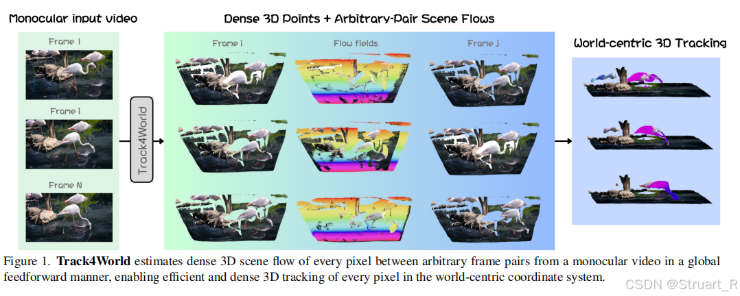 contribution:设计一个高效的前馈模型,以实现对单目视频中每一帧、每一个像素在世界坐标系下的整体3D跟踪。