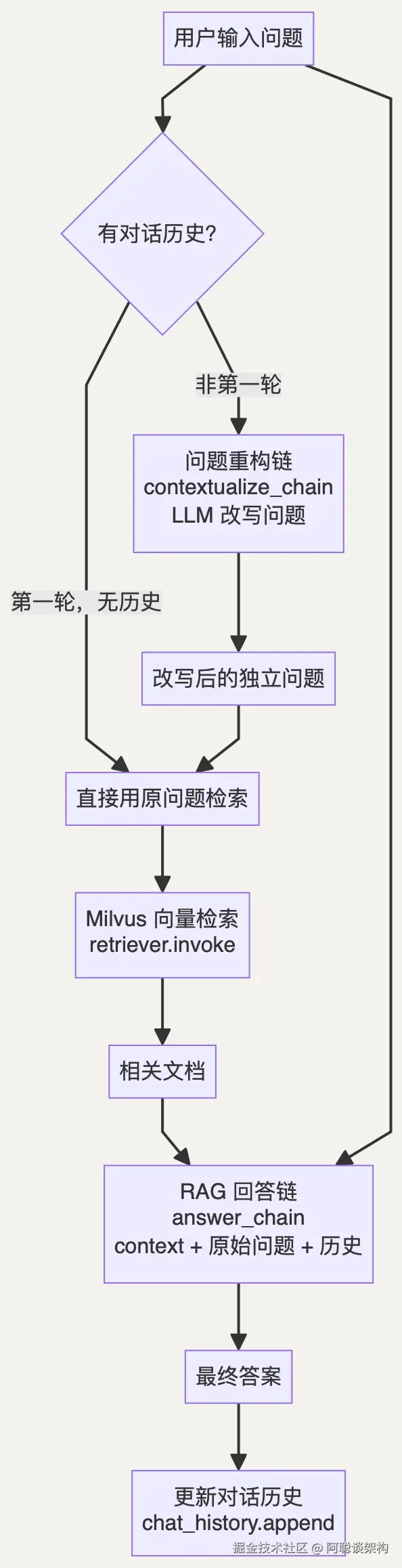 第一轮对话无历史时会跳过重构,直接使用原问题: