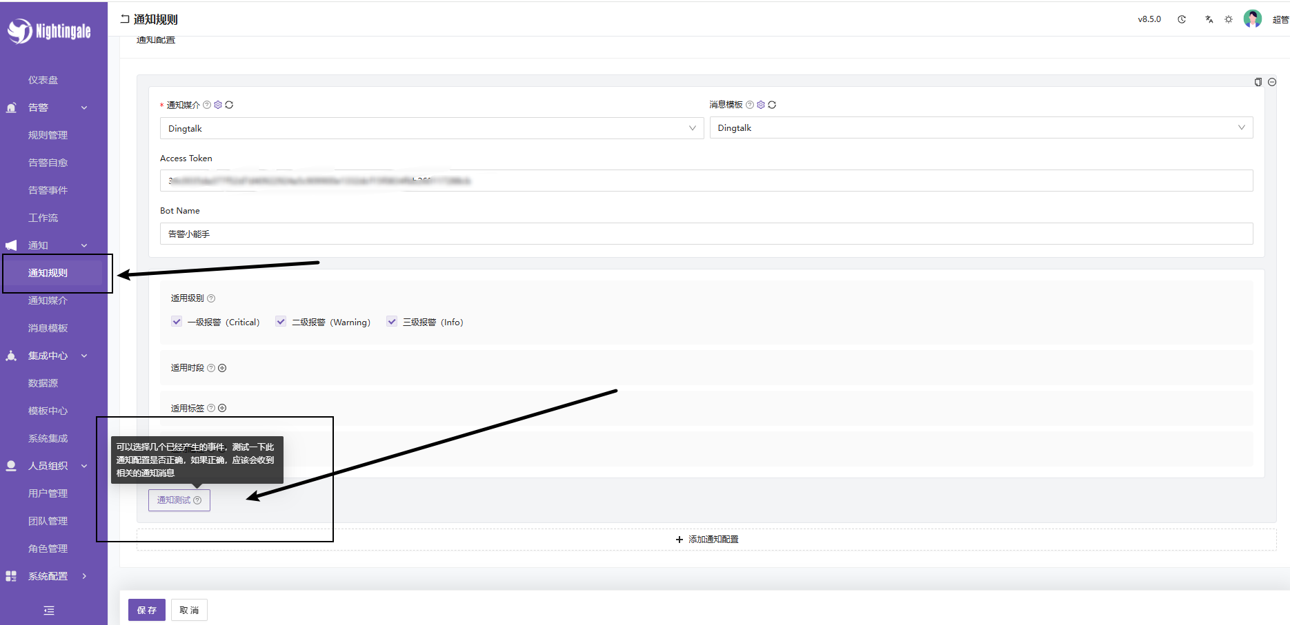 部署完成后,需配置告警通道,确保告警信息能及时推送至相关人员。夜莺支持钉钉、邮件、企业微信等多种渠道,以下以最常用的钉钉为例,讲解完整配置流程。