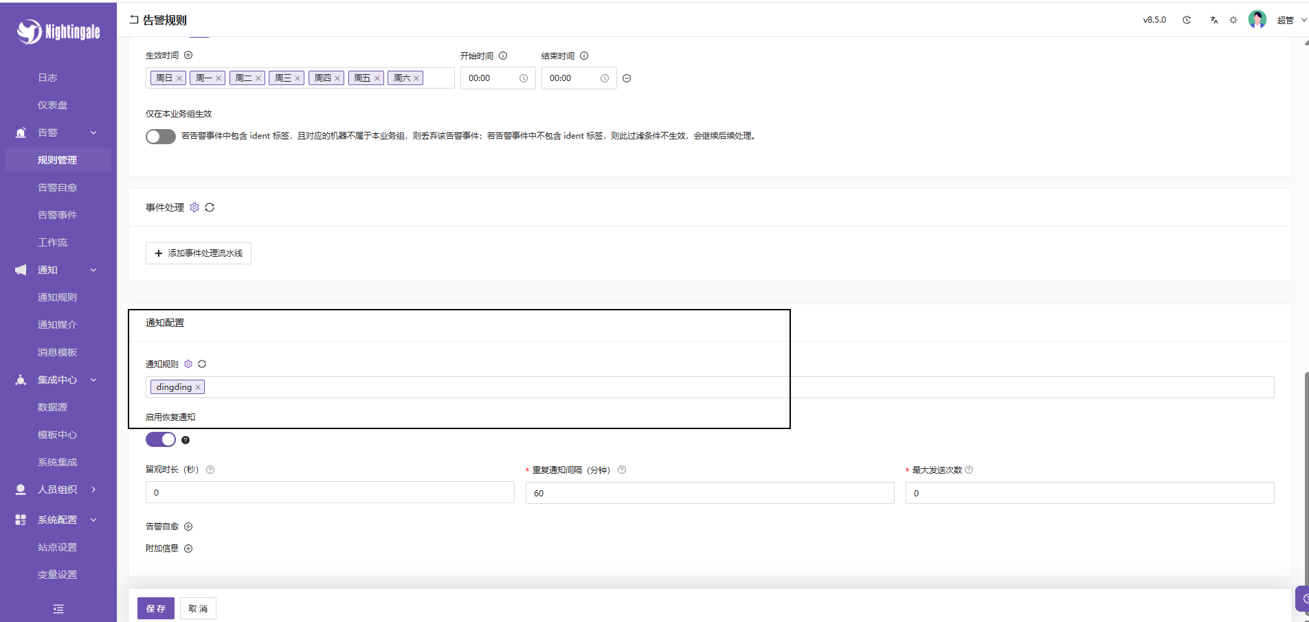 设置通知频率:如「每5分钟通知一次,最多通知3次」,避免告警消息刷屏;