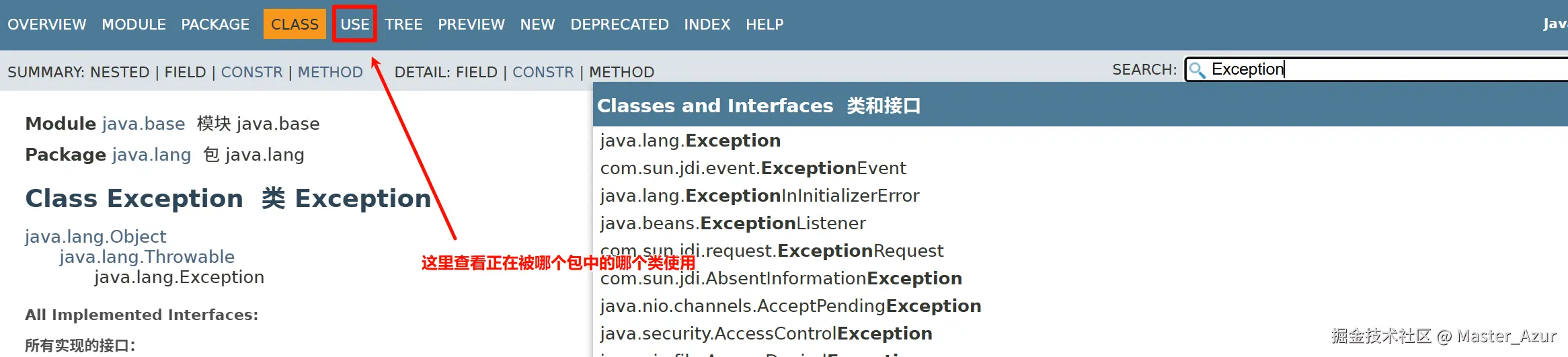 - 可以通过查文档的方式来了解各种有异常的信息:搜索到Exception之后点击use即可以查看父类Exception被哪些包中的哪些类使用,java.lang.exception 类的用途(Java SE 17 和 JDK 17) --- Uses of Class java.lang.Exception (Java SE 17 & JDK 17)