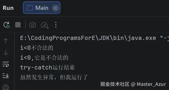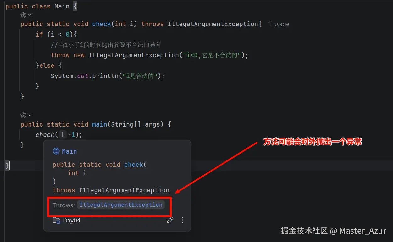 javapublic class Main { public static void check(int i){ if (i < 0){ //当i小于1的时候抛出参数不合法的异常 throw new IllegalArgumentException("i<0,它是不合法的"); //该异常需要传入一个字符串,传入的字符串通常用于提示用户抛出异常的原因 }else { System.out.println("i是合法的"); } } public static void main(String[] args) { try { check(-5); }catch(IllegalArgumentException e){ System.out.println("i<0不合法的"); System.out.println(e.getMessage()); //使用getMessage方法可以直接查找我们指定的异常抛出提醒用户的信息 }finally { System.out.println("try-catch运行结束"); } System.out.println("虽然发生异常,但我运行了"); } }