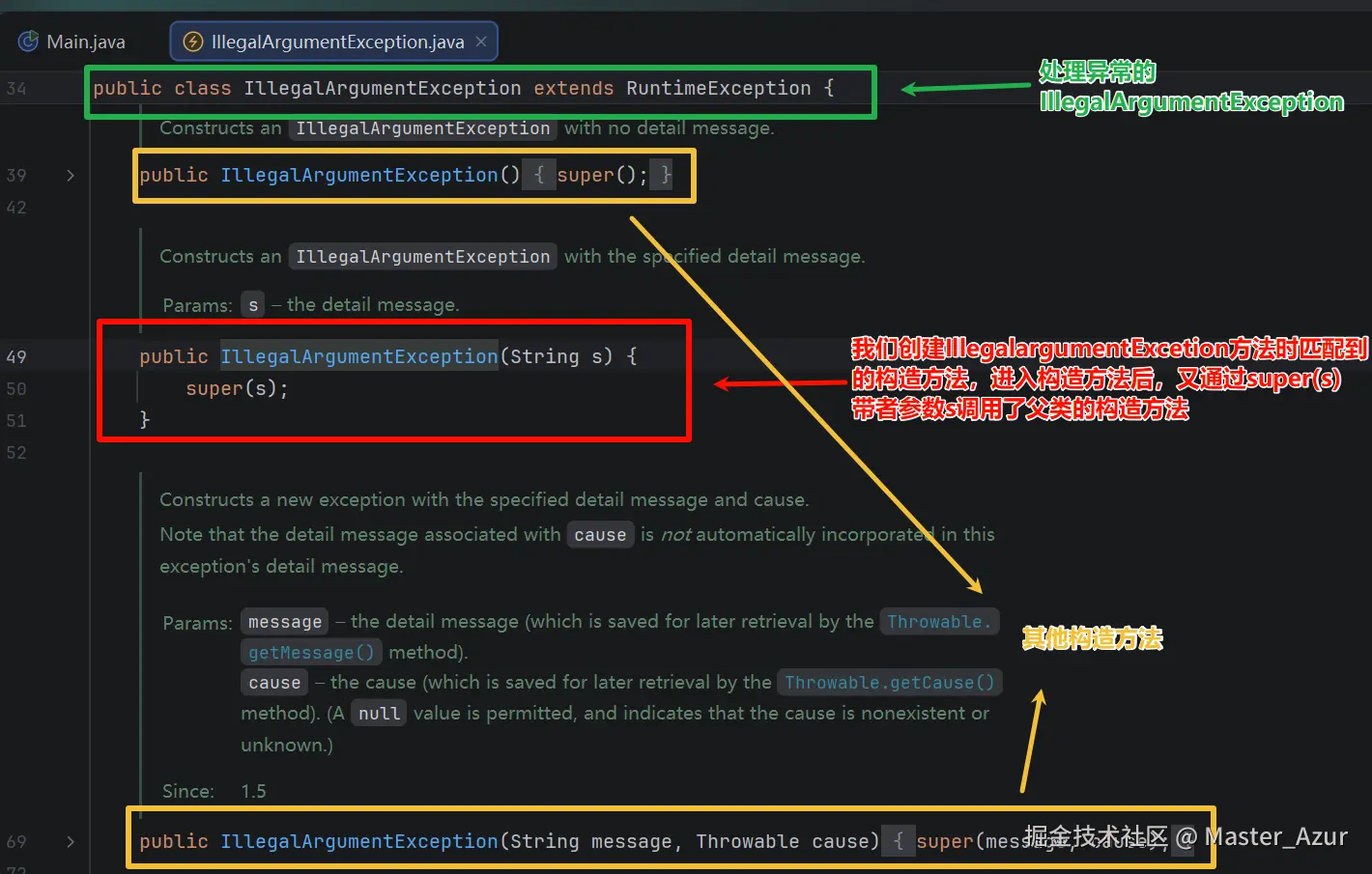 按住ctrl + 右键点击,查看IllegalArgumentException的原型,可以看到我们跳到了IllegalArgumentException类的构造方法中这个方法要求传入String类型的参数,除此之外一旁还有其他的构造方法用于重载,而IllegalArgumentException这是继承于RuntimeException类