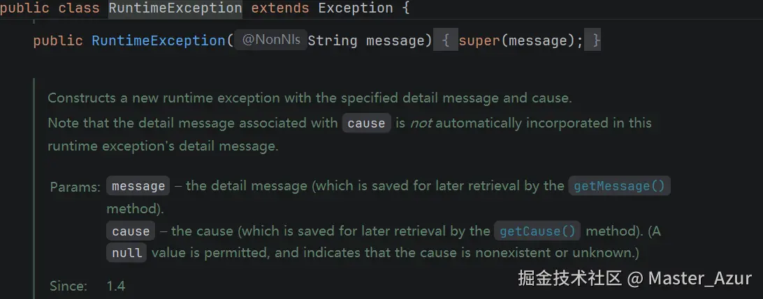 进入到RuntimeException之后可以看到匹配到了如下图所示的构造方法,带着message参数,通过super(message)又调用了父类Exception的构造方法