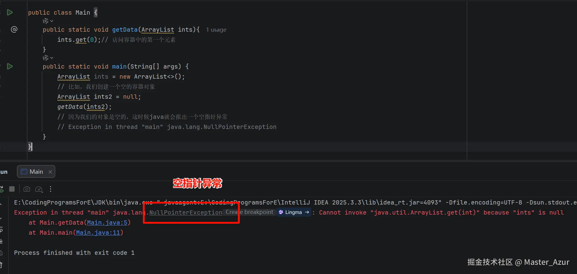 // 因为我们的对象是空的,这时候java就会报出一个空指针异常
