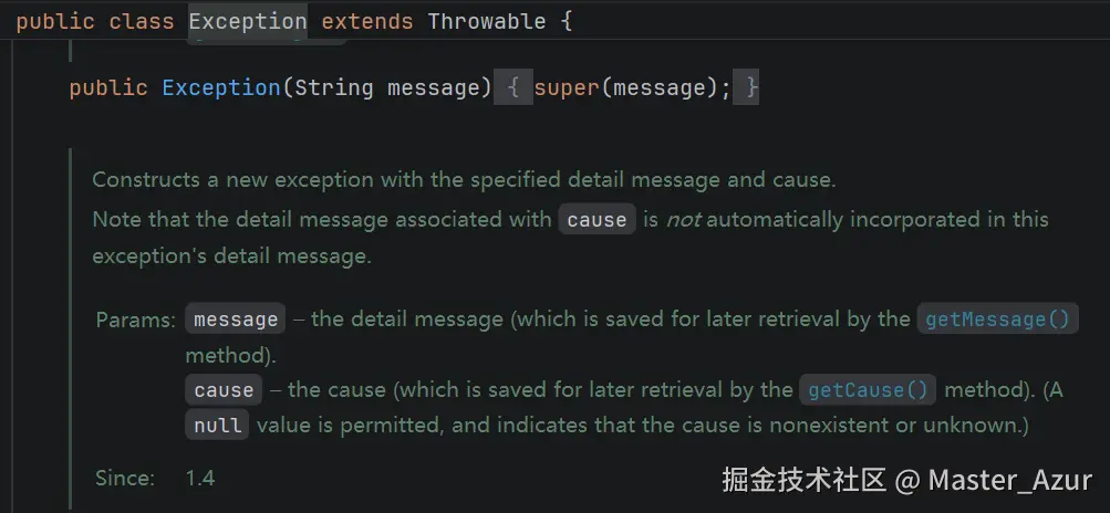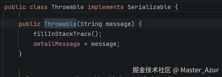 进入到Exception类之后匹配到了如下图所示的构造方法,带着message参数,通过super(message)又调用了父类Throwable的构造方法