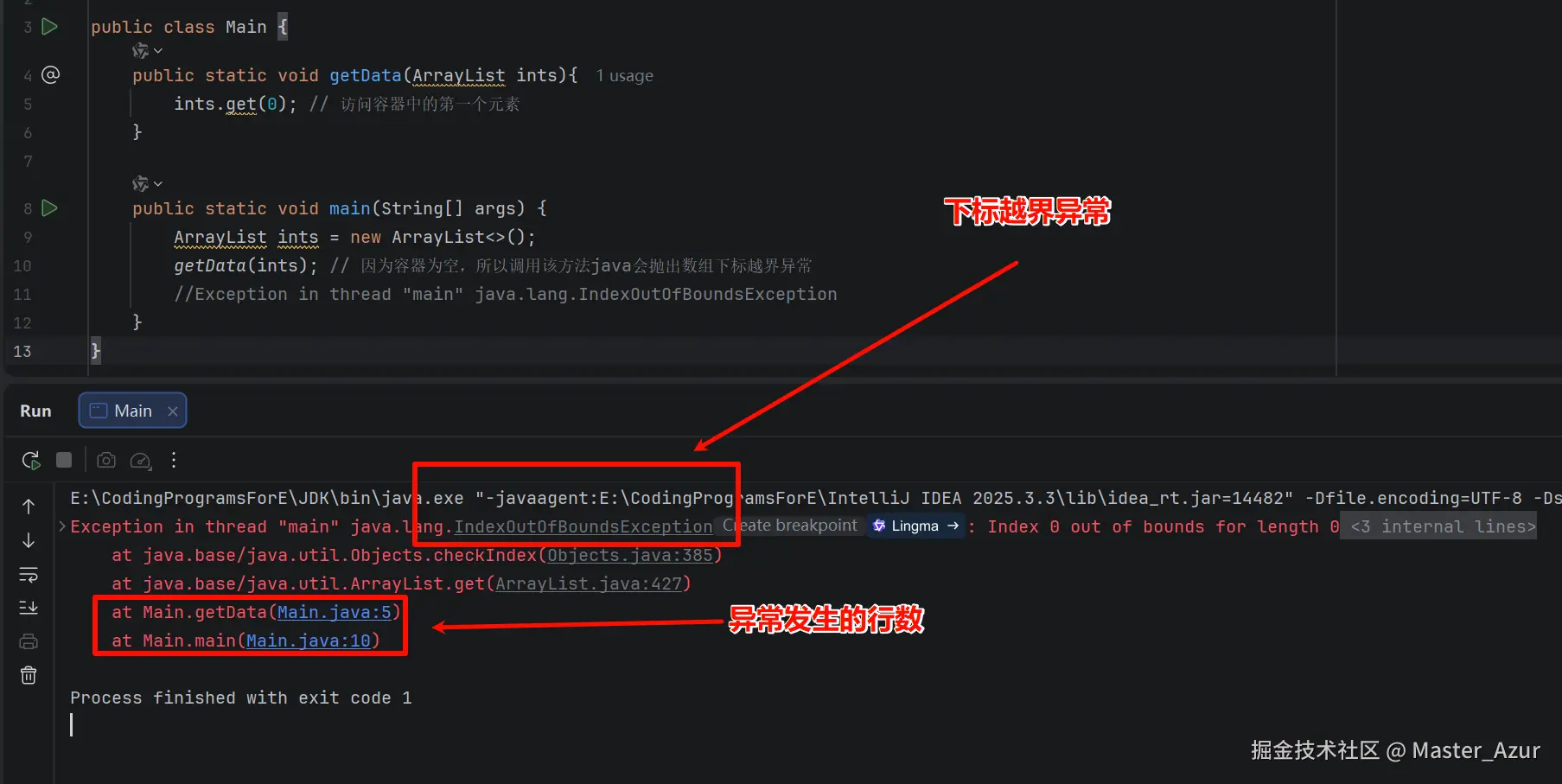 - 在java中,会有各种各样的异常,比如:在下方代码中创建了容器ints,但并未向容器中填入元素,我们直接向容器取值,这时候如果我们编译,java就会给我们报一个数组下标越界的异常