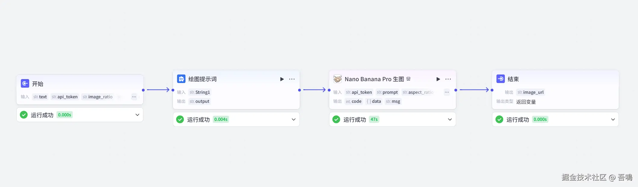 工作流不算复杂,只有简单的4个节点,只需要把输入的长文本文案和绘图的提示词模板拼接成一个完整的提示词,然后再把提示词给到Nano Banana Pro 生图节点,让它进行生图即可。