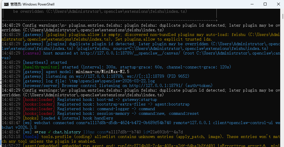然后就会弹出一个上面的界面,你可以跟它对话,问它是什么模型。如果没有弹出的这个界面的话,你应该可以看到弹出了下面这样的终端,里面有一个http://127.0.0.1:18789类似这种地址,你把这个地址复制到浏览器也就能打开上面的界面了。