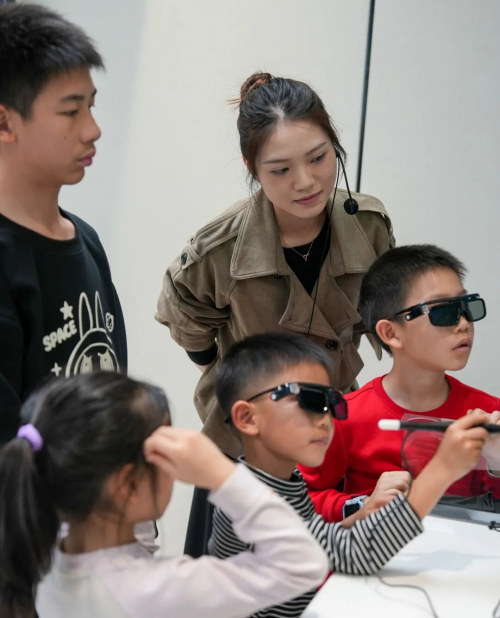 孩子们戴上VR眼镜,感受itc最新研发的AR/VR虚拟仿真教室解决方案。系统内置虚拟现实(Virtual Reality)和增强现实(Augmented Reality)技术,集成了传感器、计算机处理单元、显示屏和交互控制器等先进设备,搭配专业的3D视频资源,可有效增强互动体验和沉浸感效果,极大地提升孩子的学习兴趣。孩子们在体验中惊叹声此起彼伏:"哇塞,好神奇!"。这一刻,他们心中探索科学的种子悄然种下,对未来充满了无限的憧憬。