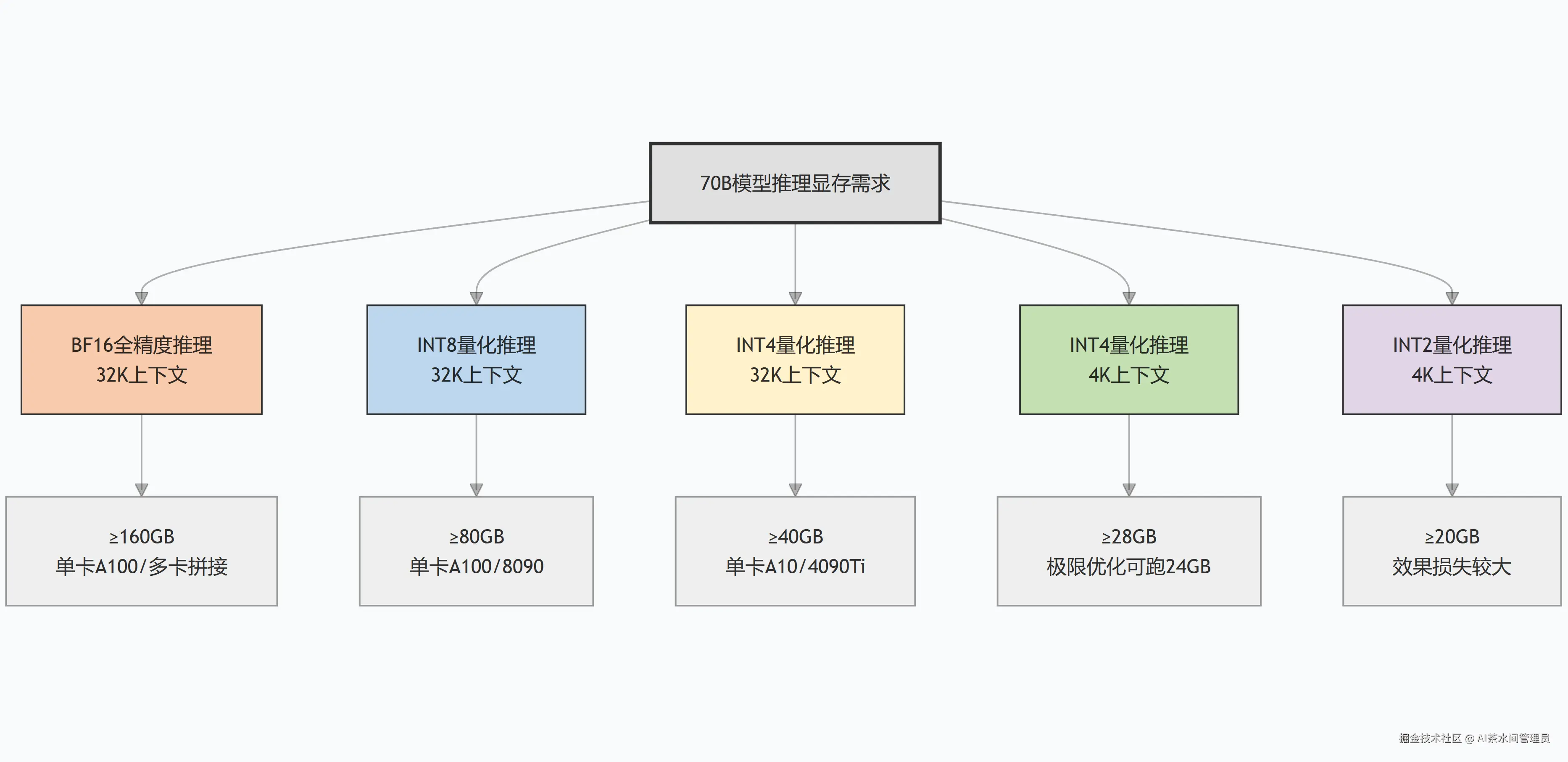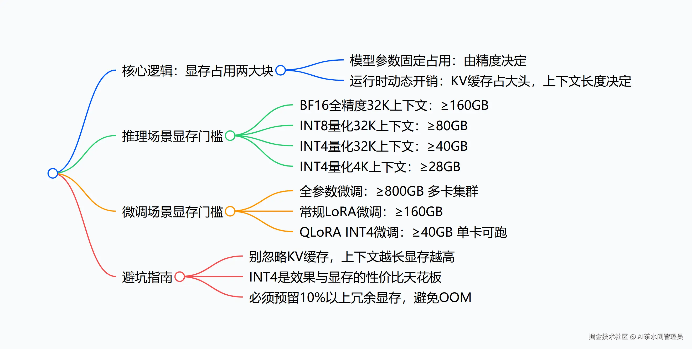 - 只算模型大小,忽略KV缓存:这是最常见的坑,INT4的70B模型本身35GB,但32K上下文的KV缓存要10GB+,总需求直接冲到45GB,24GB的卡根本扛不住;