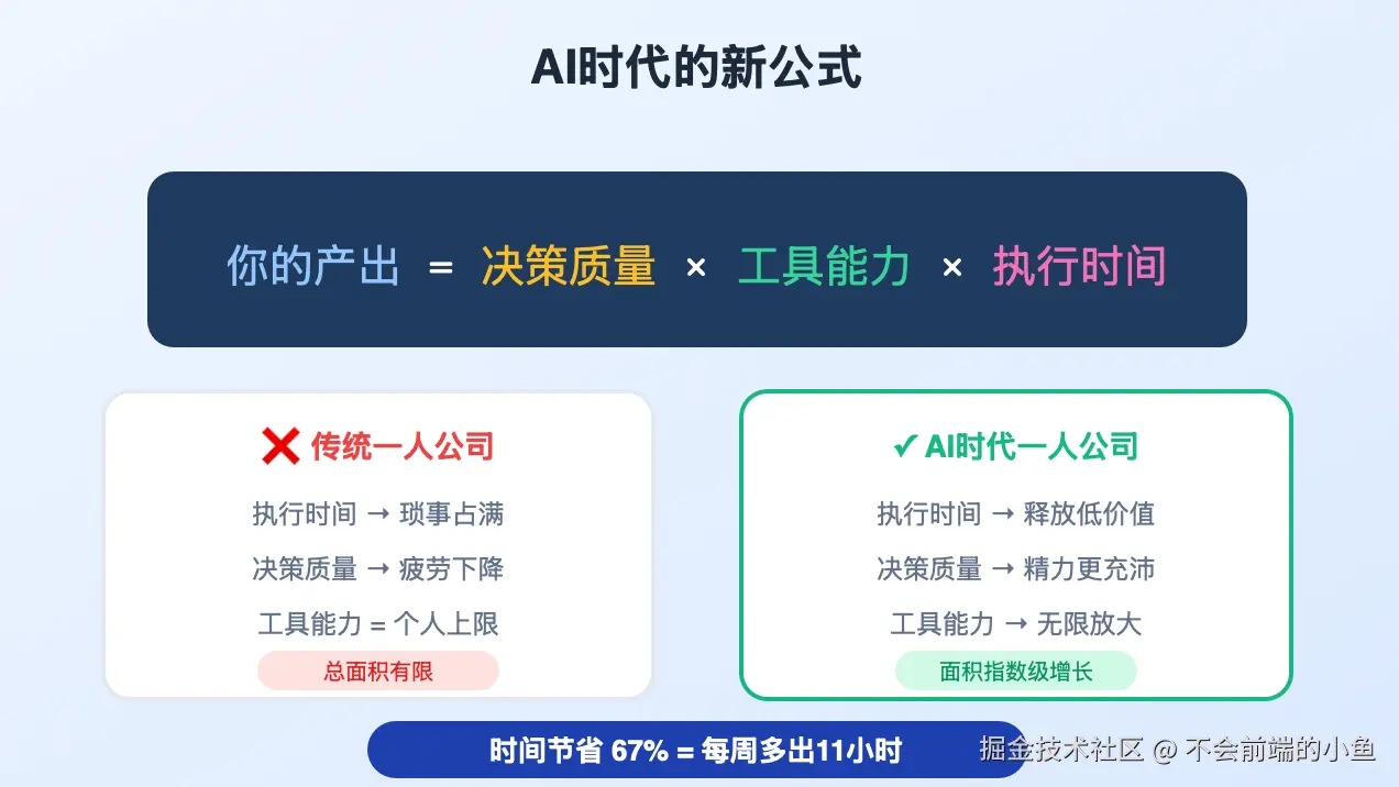 传统一人公司的问题是:执行时间被各种琐事占据,决策质量因为疲劳下降,工具能力等于你的技能上限。