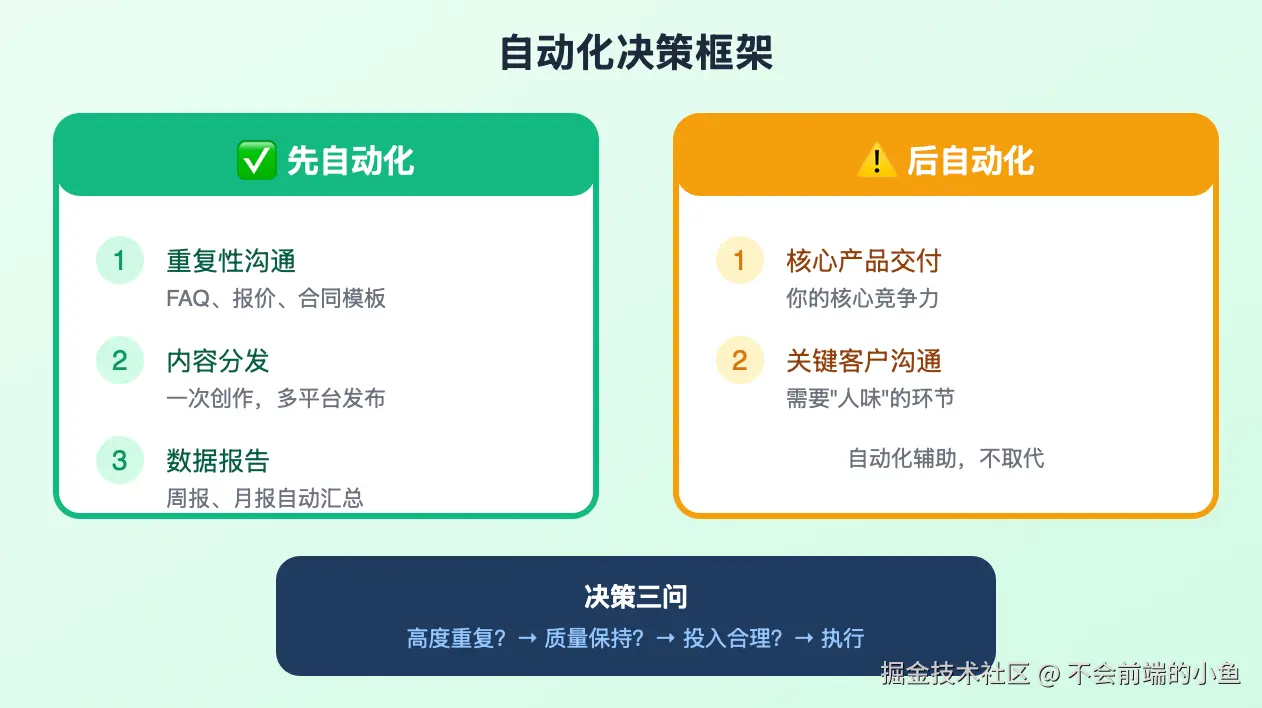 核心产品交付:这是你的核心竞争力,应该由你亲自把控质量。自动化辅助,但不要完全外包。