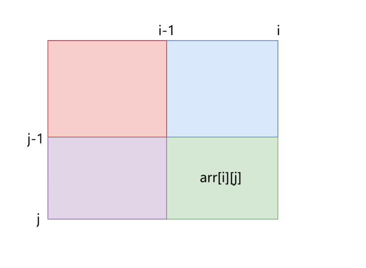 从图中我们可以看出(1,1)到(i,j)区域=红+蓝+紫+绿区域,而我们已知红色区域、红色+蓝色区域、红色+紫色区域,所以我们要想求上面那一块区域可以用(红色+蓝色区域)+(红色+紫色区域)+绿色区域-红色区域(前面有两块红色区域)