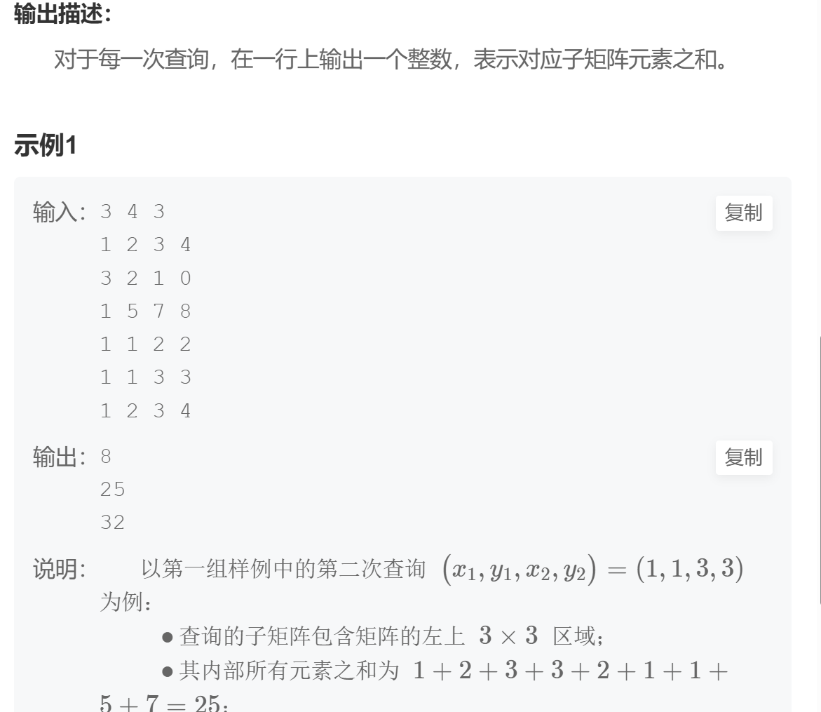 题目解析:以输入中1 1 2 2为例,在三行四列的数组中找到从坐标(1,1)开始到(2,2)区域内的和,即1+2+3+2=8.