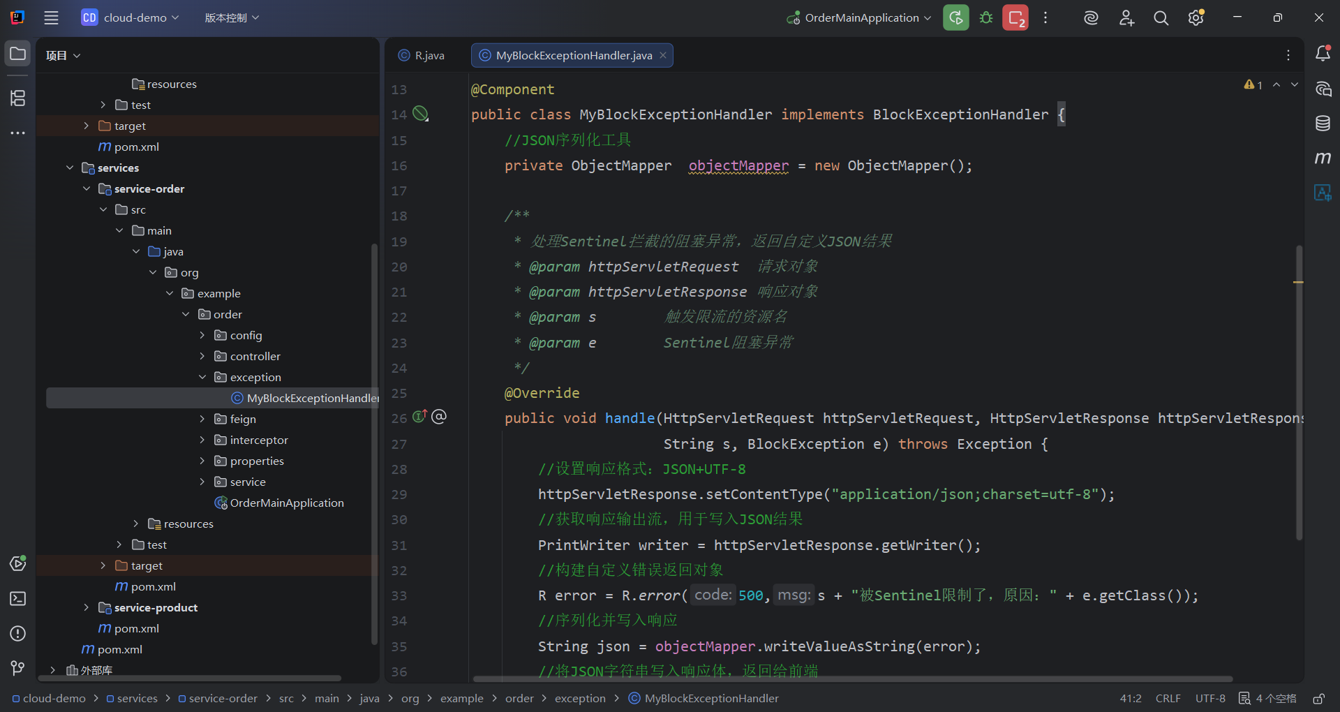 用 blockHandler 指定降级兜底方法,保证触发限流 / 熔断时接口不直接报错,返回友好结果: