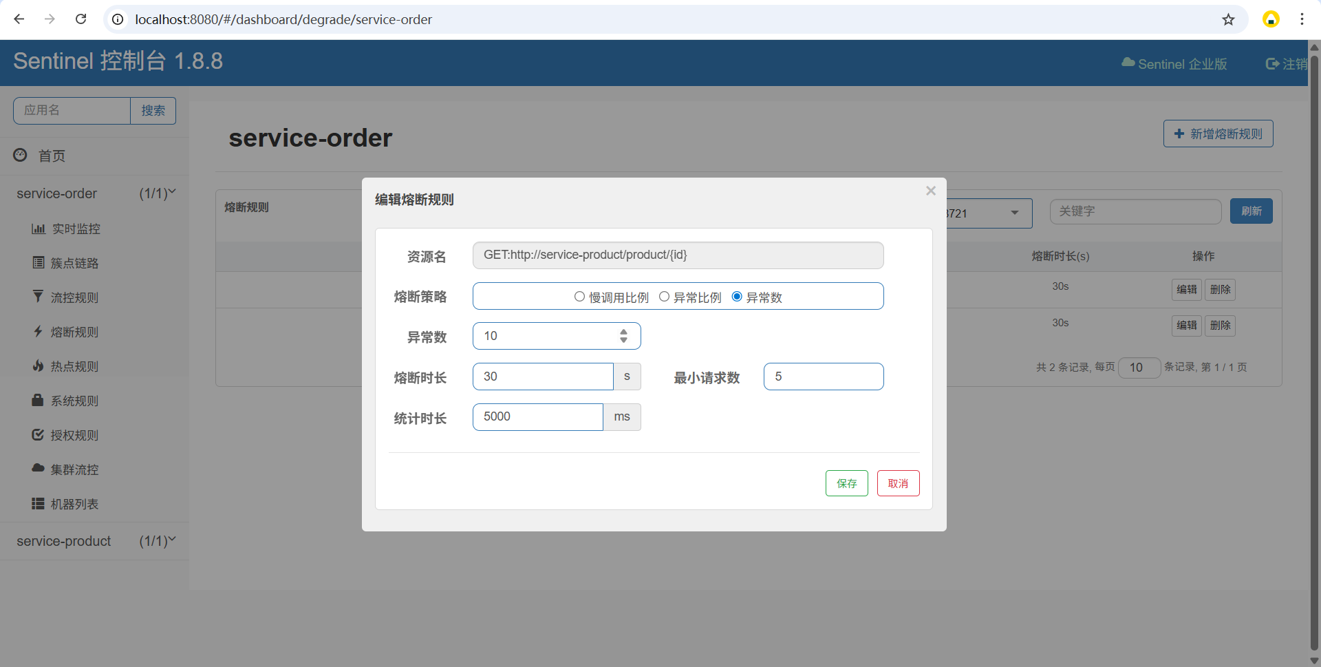 最小请求数:统计窗口内至少达到该请求数才会判断熔断(如 5,避免少量请求误判)
