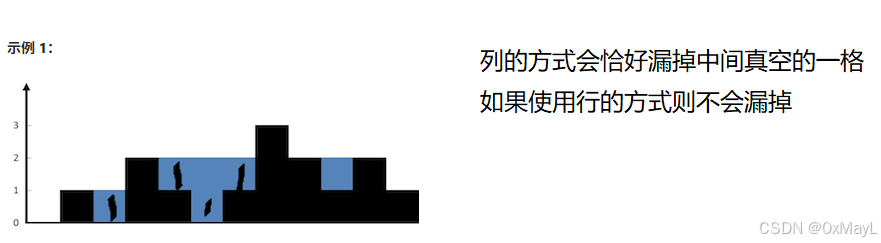- 暴力做法:对于当前台阶,选择左右两边最高的柱子,然后按照列的方式计算当前台阶的雨水量。