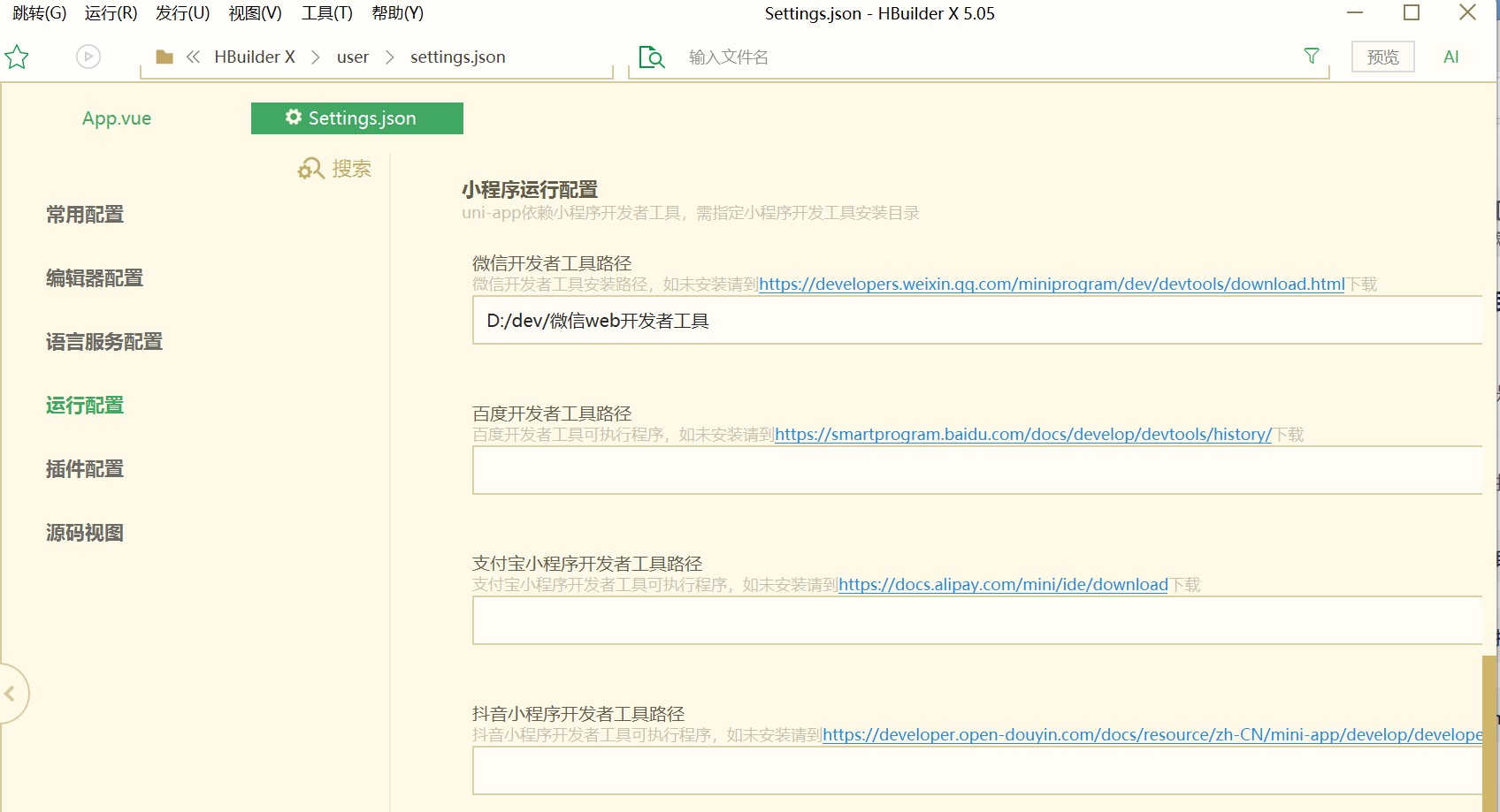然后下载好后在HbuilderX里点击工具设置,出现这个小程序运行设置,将微信开发者工具的下载路径放在这里
