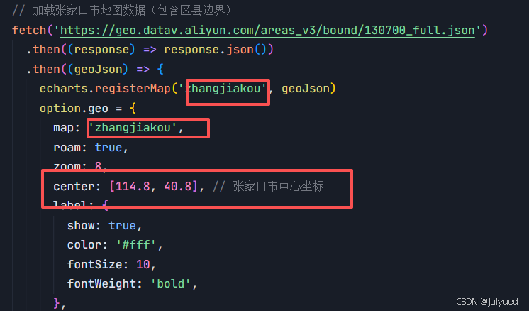 目前是张家口区域,想实现别的区域,将红框中的修改即可。(如china)