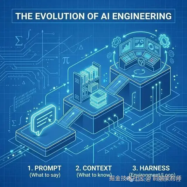 Harness Engineering(马具/驾驭工程)由 HashiCorp 联合创始人 Mitchell Hashimoto 在 2026 年初提出。它标志着软件工程核心竞争力的重大转移:超越了早期的提示词工程 (Prompt Engineering) 和上下文工程 (Context Engineering)。
