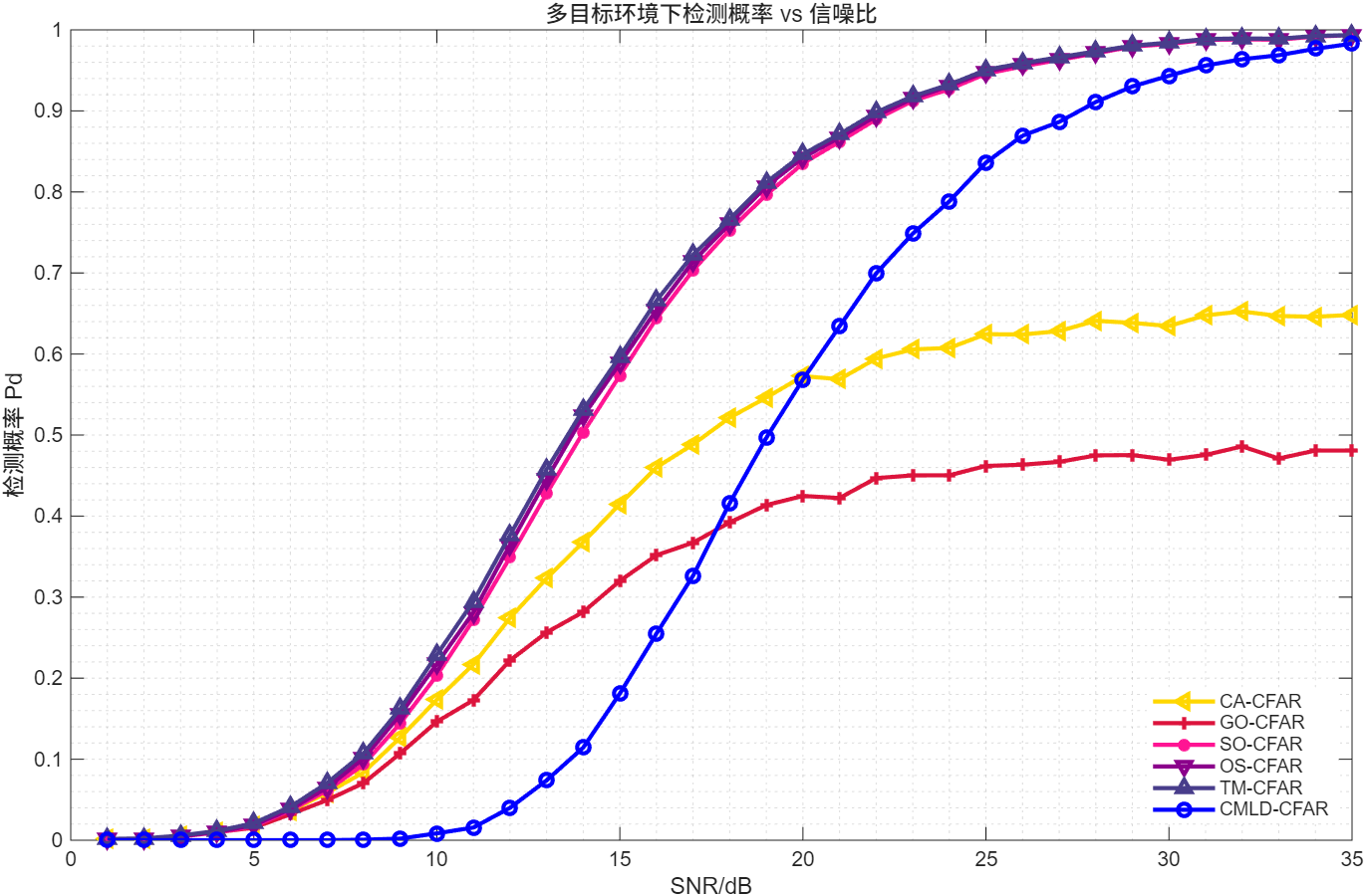 | 多目标 Pd-SNR | CA-CFAR | TM/CMLD/OS | 鲁棒性提升趋势 |