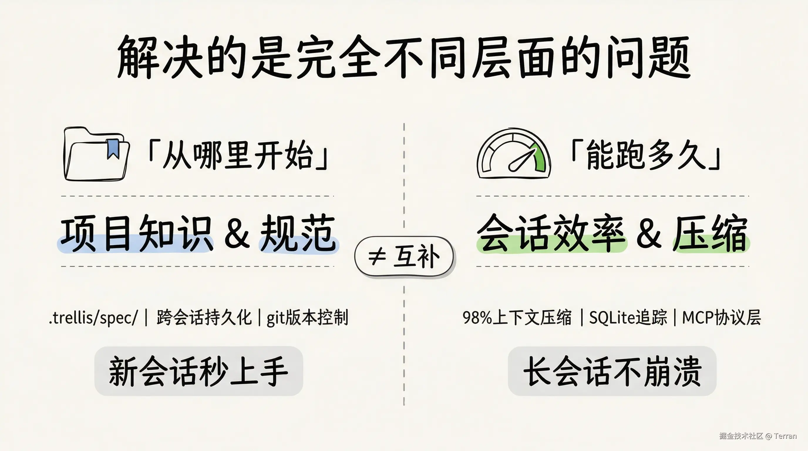 - Trellis 解决的是"从哪里开始"------新会话启动时,AI 就知道项目规范、历史决策和当前任务