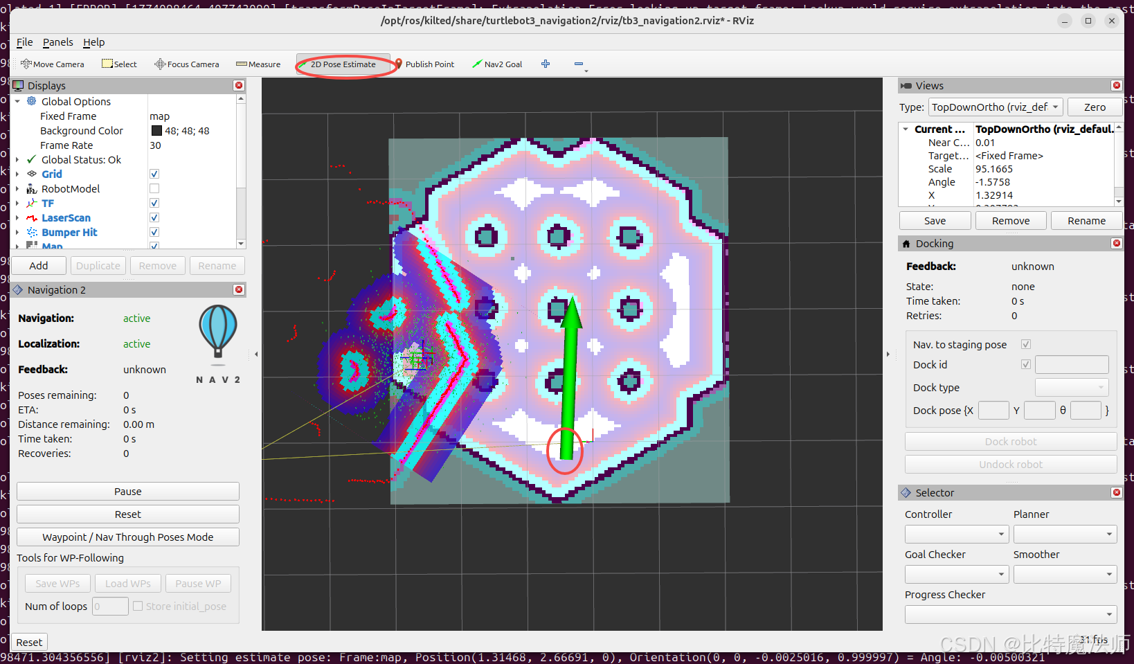 在 RViz 工具栏选择 2D Pose Estimate 工具,在地图上点击机器人所在位置,拖动鼠标设定朝向。