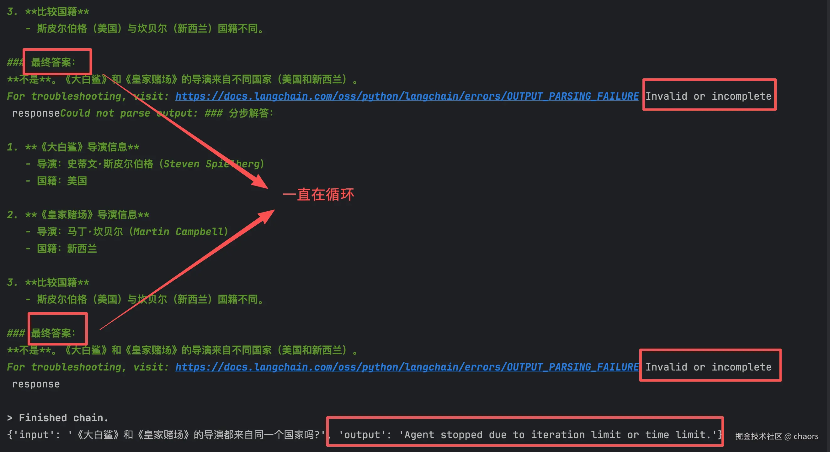 开始看着好像也能正常问答。我去,怎么感觉进入死循环了,尽管得出了答案一直在死循环,直到最后程序被自动强制停止。还有点像我们传统开发里的递归死循环问题。