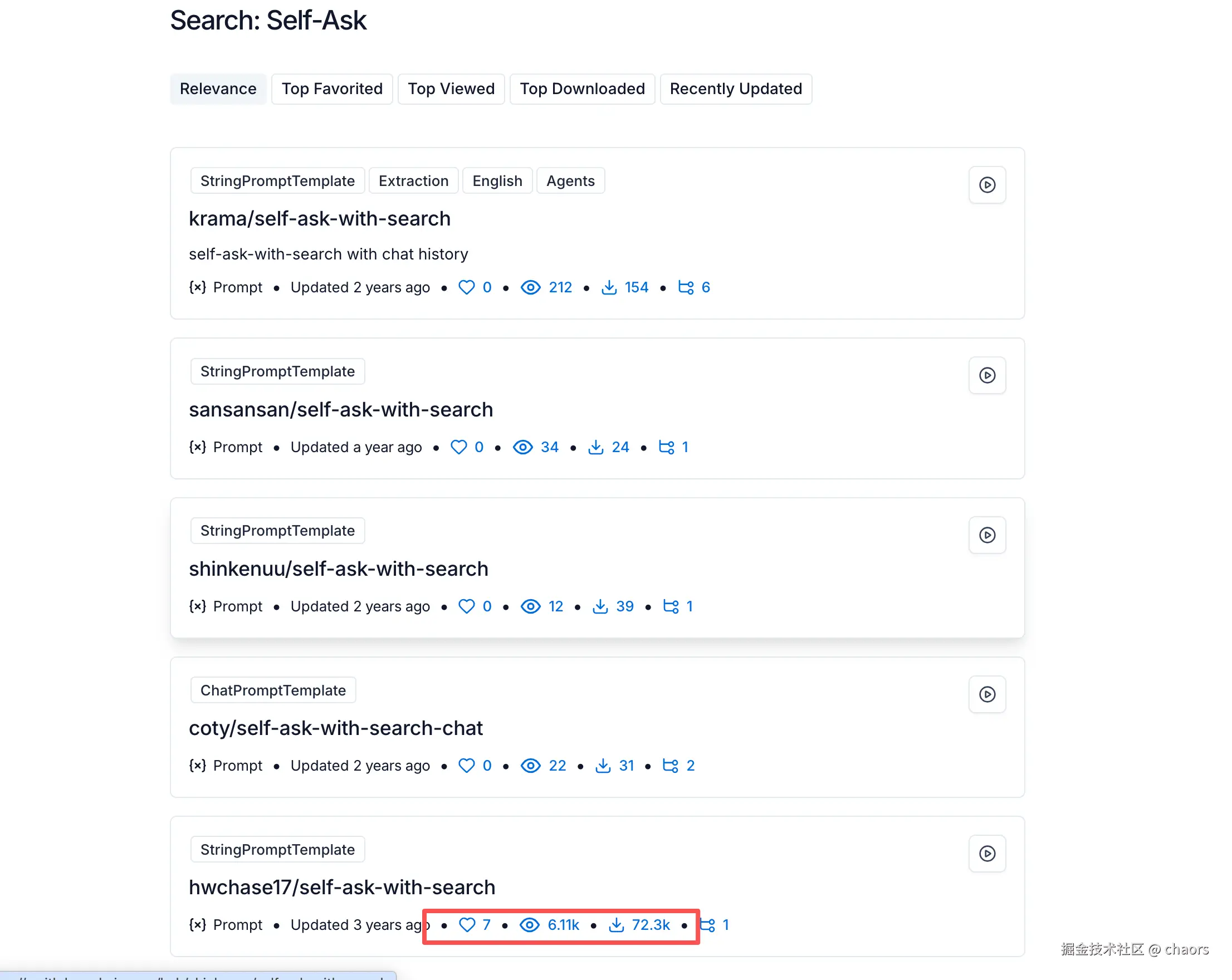 我们还是尝试在 Langsmith-Hub 搜索 "Self-Ask",模板还有好几个呢,我们一般选择浏览和下载量最多的,如:hwchase17/self-ask-with-search。