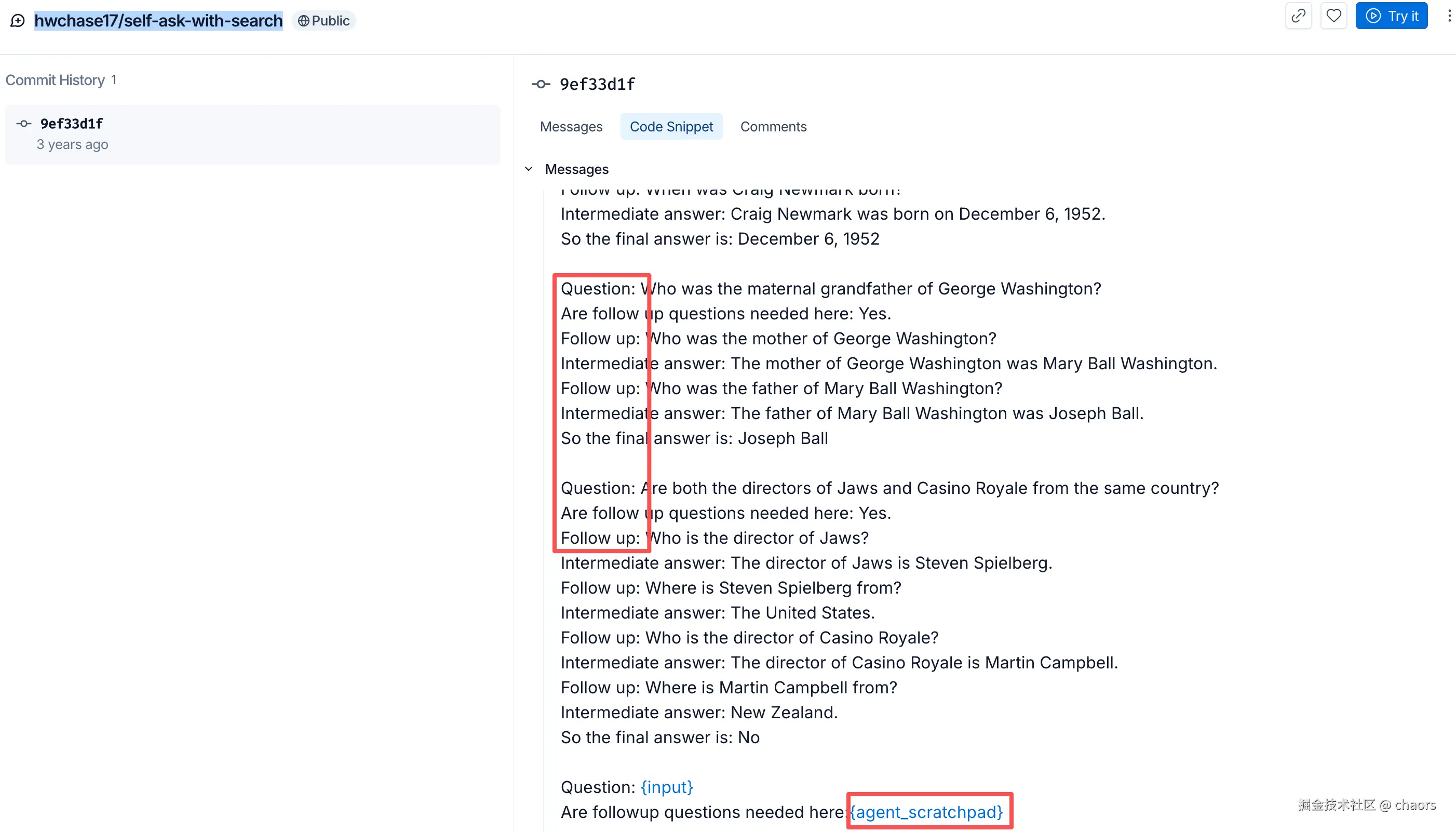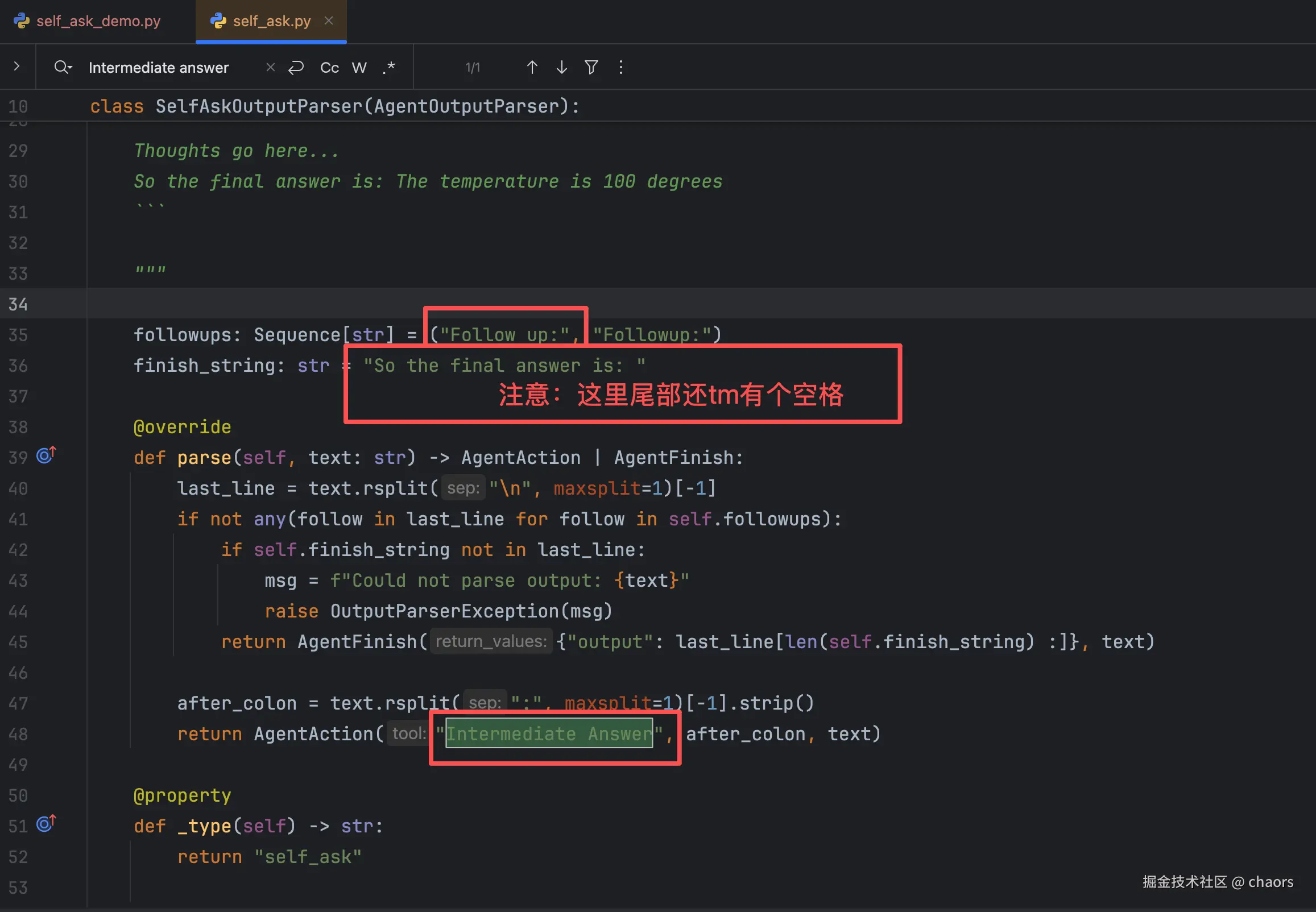 那么这是为什么呢?好在 Langchain 都是开源代码,我们不妨直接查看源代码看看。经过一番追踪,最终我定位在了 self_ask.py 文件: